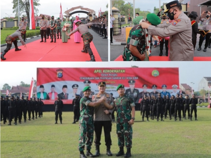 PEKANBARU, (Kanalkini.com) - Komandan Korem (Danrem) 031/Wirabima, Kolonel Inf Parlindungan Hutagalung, bersama Brigjen Syech Ismed disambut dengan gegap gempita oleh ratusan personel Polda Riau.Dibawah kepemimpinan Irjen Mohammad Iqbal, Polda Riau menggelar acara penerimaan dan pelepasan Komandan Komando Resort Militer (Danrem) 031/Wirabima. Rangkaian kegiatan dilangsungkan dengan khidmat meriah dan semarak. Senin (21/2/2022).Acara tersebut juga dihadiri Gubernur Riau, Ketua DPRD Riau, As