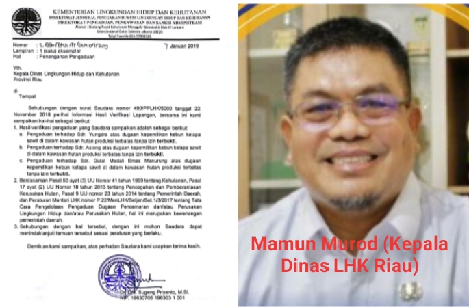 PEKANBARU, (Kanalkini.com) - Direktur Eksekutif CERI Yusri Usman mempertanyakan sikap Kepala Dinas Lingkungan Hidup dan Kehutanan Provinsi Riau Mamun Murod yang tidak kunjung menindaklanjuti surat Direktur Pengaduan, Pengawasan daon dan Sanksi Administrasi Direktorat Jenderal Penegakan Hukum Lingkungan Hidup dan Kehutanan Kementerian Lingkungan Hidup dan Kehutanan tertanggal 7 Januari 2019.