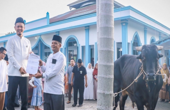 PEKANBARU, (Kanalkini) - Agung Nugroho Wali Kota Pekanbaru, menyerahkan langsung sapi kurban bantuan dari Presiden RI, Prabowo Subianto. Bantuan sapi kurban ini dalam rangka Idul Adha 1446 H di Kota Pekanbaru.Mereka yang mendapat sapi bantuan dari Presiden RI ini adalah masyarakat RW 04 Kelurahan Sri Meranti, Kecamatan Rumbai. Proses penyerahan berlangsung di halaman Masjid Hijratul Haq. Jumat, 06/06/25.Sapi yang diserahkan adalah sapi jenis Brahman. Berat sapi kurban dari Presiden RI nyaris