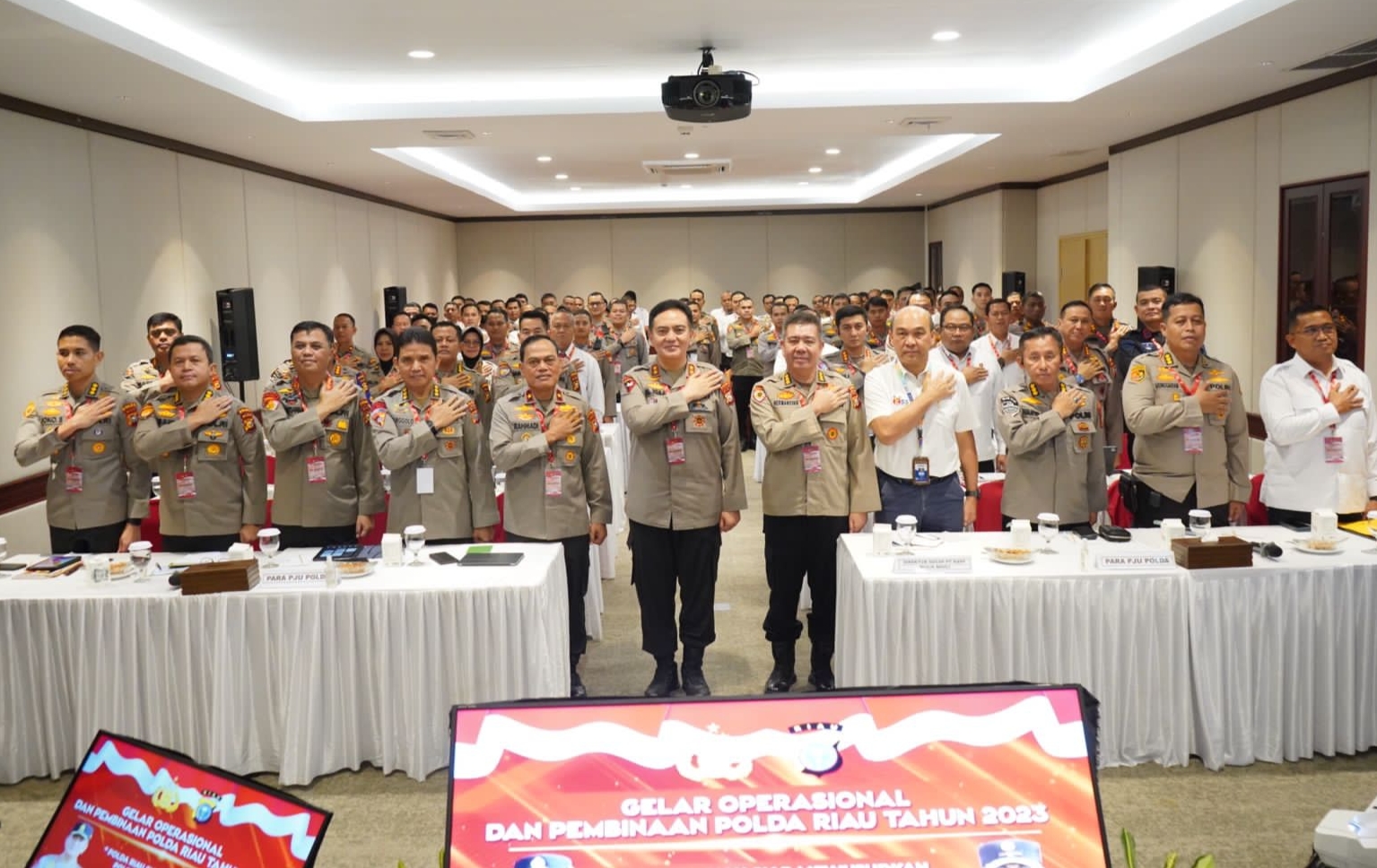 PELALAWAN, (Kanalkini.com) - Mengusung tema ‘Polda Riau Siap Mewujudkan Polri Yang Melayani’ kepolisian Daerah Riau melaksanakan Gelar Operasional dan Pembinaan di Hotel Unigraha, Kompleks PT. RAPP, pada Senin (6/3/2023). Gelar yang dilaksanakan Polda Riau ini diikuti oleh seluruh Pejabat Utama Polda Riau termasuk Kapolres, Kabag dan Kasat jajaran Polres se-Riau.