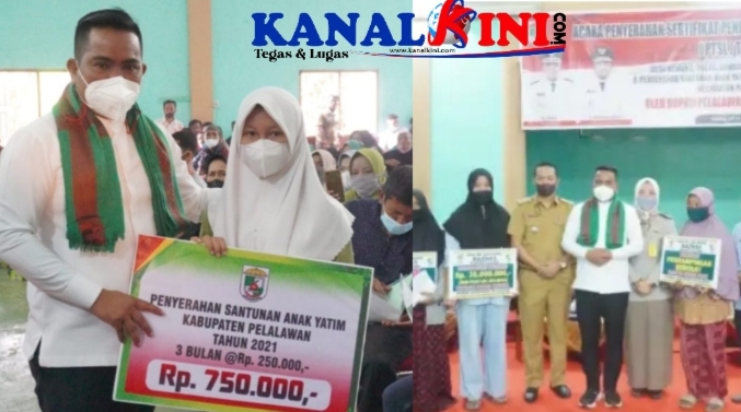 Selain penyerahatan sertifikat, Bupati Pelalawan menyerahkan santunan kepada anak yatim dan pemberian insentif petugas rumah ibadah di Kecamatan Pangkalan Kuras yang