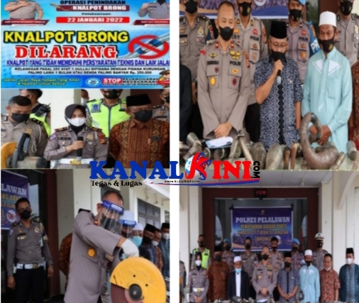 PELALAWAN, (Kanalkini.com) - Polres Pelalawan Melakukan Pemusnahan Kenalpot bukan standart (Brong) bertempat di Mapolres Pelalawan Kota Pangkalan kerinci. Pemusnahan Barang Bukti Knalpot Brong ini dipimpin langsung oleh Wakapolres Pelalawan Kompol Raden Edi Syaputra S.Ag, Kasat Lantas AKP Lily Sulfiani, S.IK yang didampingi KBO Sat Lantas IPDA R. Sinaga, Kasi Humas AKP Edy Harianto, SH serta dihadiri Tokoh Masyarakat H. Tengku Kama Ruzzaman, H. Zulkifli, Batin Nuar, H. Mawi, H. Saniman dan