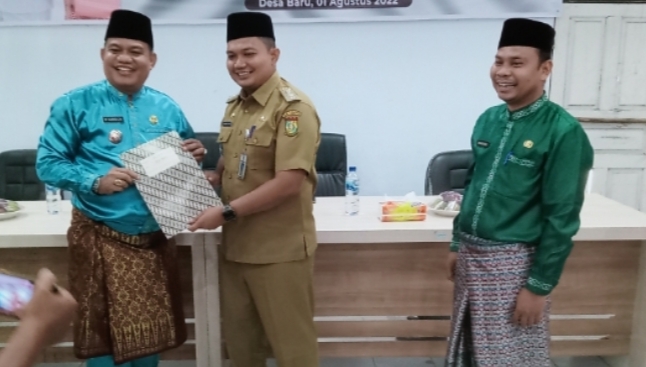 PJ Kepala Desa Desa Baru Arpan Ritonga, SE.ME menyerahkannya kepada M.Haris, CH sebagai kepala desa Desa Baru Difinitif, Periode 2022 -