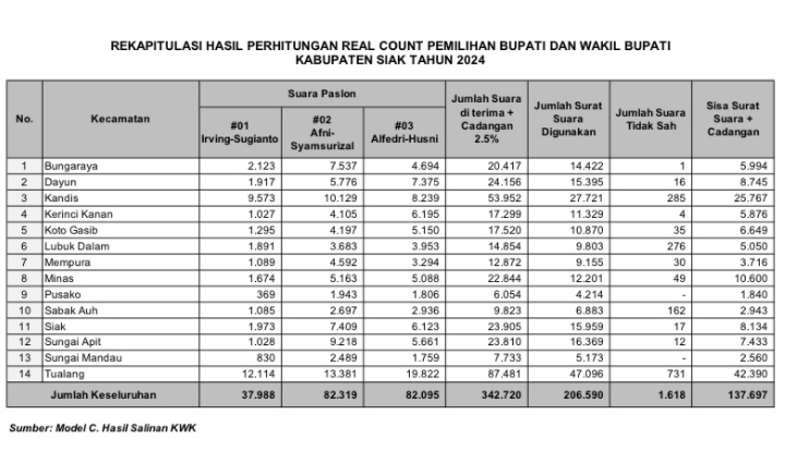 Total Suara Sah Siak 2024, Tercatat Sebanyak 202.402, Dengan 4.202 Suara Tidak Sah KPU Kab. Siak Tetapkan Dr Afni-Syamsurizal Pemenang Pilkada Siak 2024
