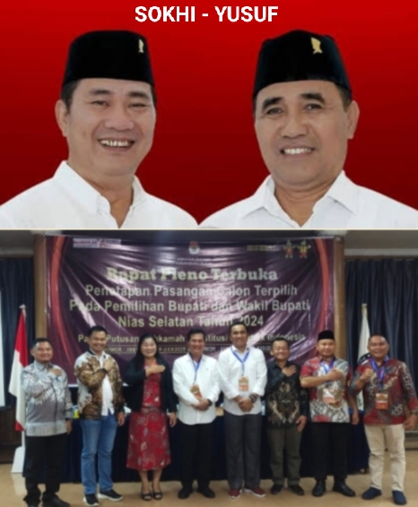 NESEL, (Kanalkini.com) - Pasangan Calon nomor urut 1, Sökhiatulö Laia dan Yusuf Nakhe, ST MM (Sokhi-Yusuf), calon nomor urut 1 pada pilkada 27 Nopember 2024 lalu, ditetapkan sebagai Bupati dan Wakil Bupati Kabupaten Nias Selatan Periode 2025-2030. Penetapan ini dilakukan dalam rapat pleno terbuka yang digelar oleh Komisi Pemilihan Umum (KPU) Kabupaten Nias Selatan di Hotel Yonnas. Jalan Pasir Putih, Kelurahan Pasar Teluk Dalam, Nias Selatan pada. Kamis. 6/2/2025.