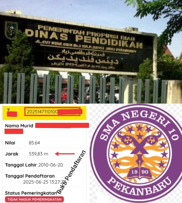 Salah satu Wali murid berinisial FL yang mendatangi kantor madia ini yang beralamat di Jl. Lintas Timur, Kel. Mentangor. Kec. Kulim-Kota Pekanbaru. Dalam keluh kesahnya, menyampaikan atau menceritakan bahwa anaknya yang telah mendaftar di SMA N 10 pada tanggal 25 Juni 2025, dan nomor pendaftaran 2025147110100303xxxx, Melalui jalur Domisili atau Zonasi (titik kordinat, jarak tempat tinggal wali murid/siswa sesuai keberadaan Kartu Keluarga (KK). Dengan berjalannya waktu setelah di daftar melalui Online di laman Website: https://pmb.riau.go.id/, hingga sampai di penghujung akhir pendaftaran dan penutupan pendaftaran nama anaknya tak kunjung Lulus atau Lolos, dengan keterangan, "Tidak Masuk Pemeringkatan".