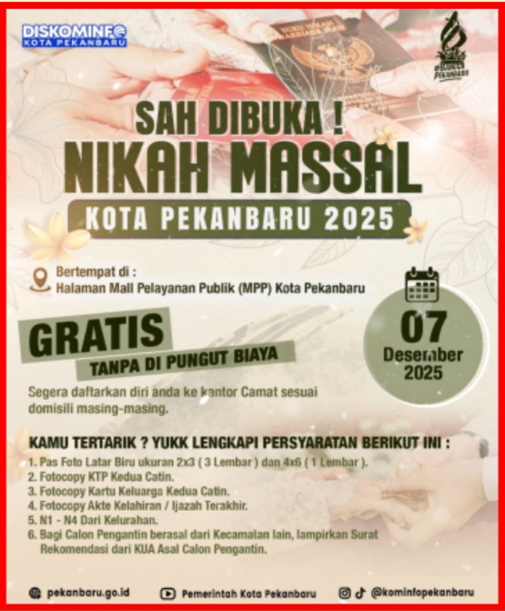 "Masih ada waktu satu bulan lagi. Sekarang sudah lebih 40 calon pasangan yang mendaftar," ungkapnya. Senin, 3/11/25. Di waktu yang tersisa, Walikota Agung menghimbau supaya bagi calon pasutri yang ingin menikah tahun ini supaya bisa memanfaatkan Nikah Massal Gratis yang diprogramkan Pemko Pekanbaru.